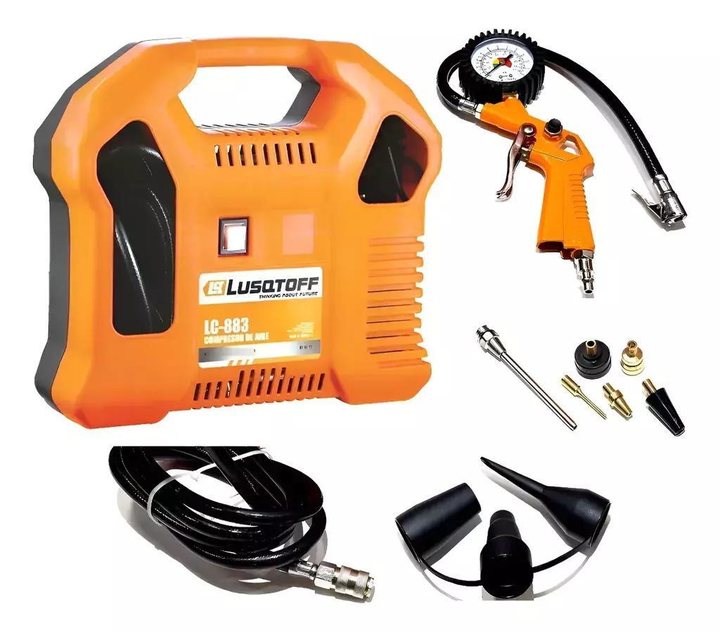 El compresor mini LC-883 sin aceite es práctico, portátil y confiable, ideal para el hogar o como equipo de auxilio en el auto. Con un caudal de 180 l/min y presión máxima de 115 psi, permite inflar rápidamente pelotas, bicicletas, motos y automóviles.
